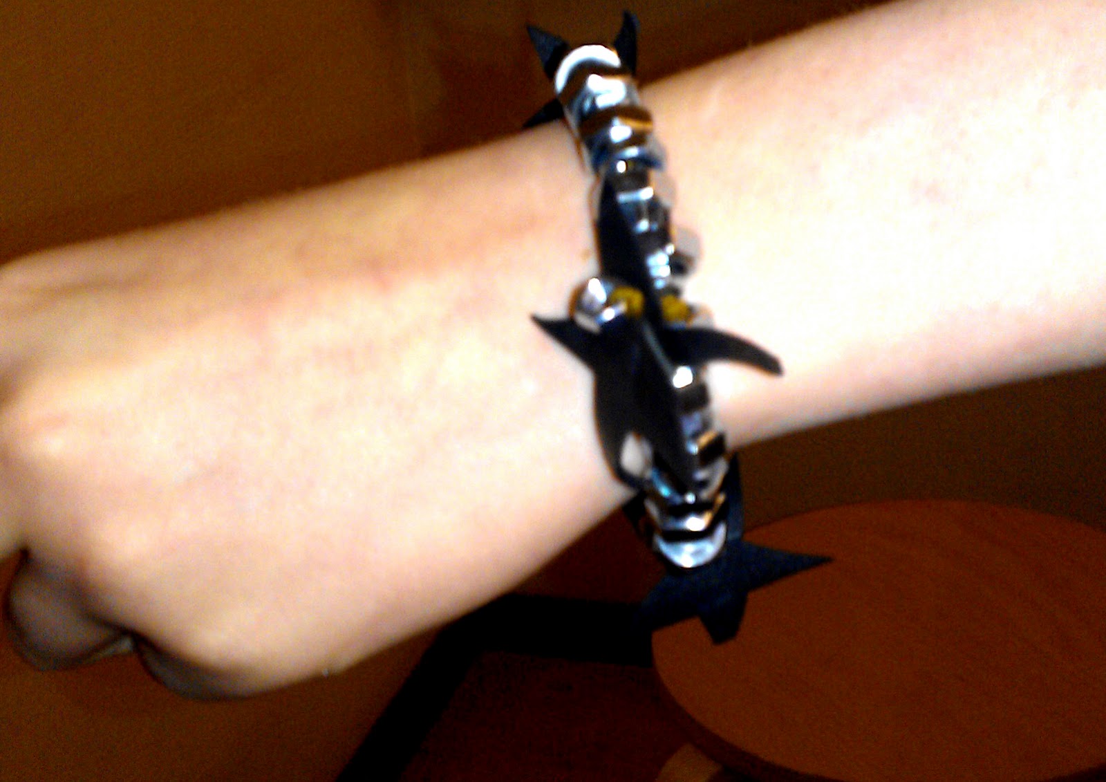 jeg laget også et armbånd med litt punkerstil av strikk, muttere 5mm og 1cm, også klippet jeg ut stjerner av sykkelgummi, og festet med strikk.